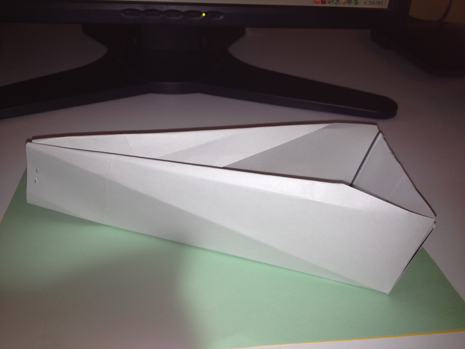 - Once you have the back glued, face it towards you and fold down or inside of the boat along the outside (now top) diagonal lines.