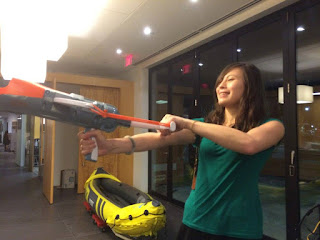 Once the kitchen was emptied of all the tables (they were used for dining at the front of the office), the room is quite wide. Two people in the boat, two people PUSHING the boat, made it a moving target game. I used four golf chipping nets because they stand on their own. Each contestant had a bucketful of soft balls and "guns" that they flung balls into the nets as they rolled on by them.