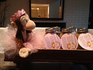 Since the mom-to-be couldn't come across country for the shower, we put her picture on the mantle above the ballerina monkey banner. We wrapped her gifts at the party and packed them in a HUGE box to be shipped to California.